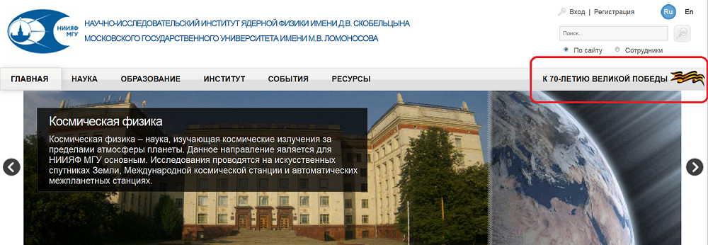 Вход на новый сайт возможен через институтский с помощью расположенной в верхней части справа кнопки «К 70-ЛЕТИЮ ВЕЛИКОЙ ПОБЕДЫ», или по этой ссылке: http://pobeda70.sinp.msu.ru/