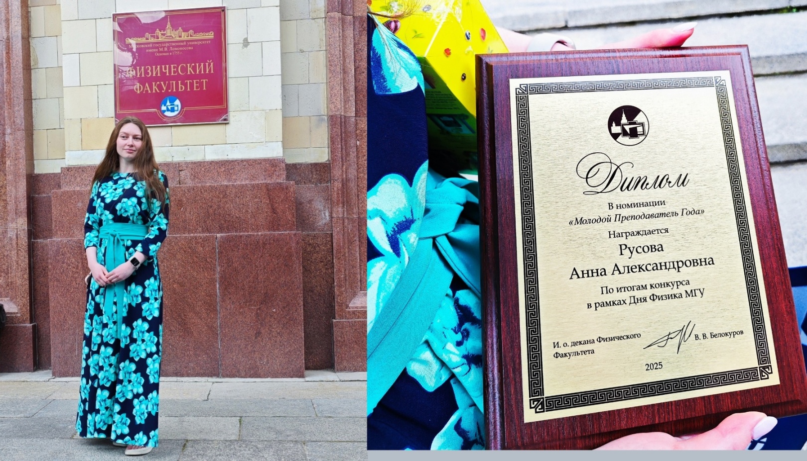 17 мая во время традиционного Дня Физика были объявлены победители на звание лучших в различных номинациях. Лучшим молодым преподавателем была названа ведущий инженер НИИЯФ МГУ, ассистент кафедры общей ядерной физики физического факультета, Анна Александровна Русова. Как известно, Анна Александровна ведёт большую научную и учебную работу и это уже не первая её награда, она лауреат многих премий и стипендий для молодых учёных и преподавателей. Стоит напомнить, что победителей к Дню Физика выбирают на основании голосования студентов физического факультета.