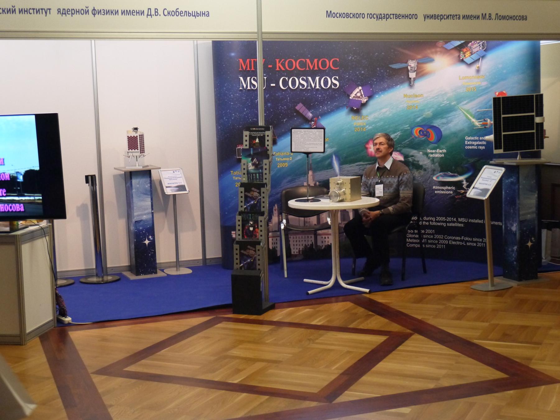 На площадке около 12 квадратных метров был выставлен стенд с изображением шести спутников, на которых установлена научная аппаратура, разработанная сотрудниками НИИЯФ МГУ.