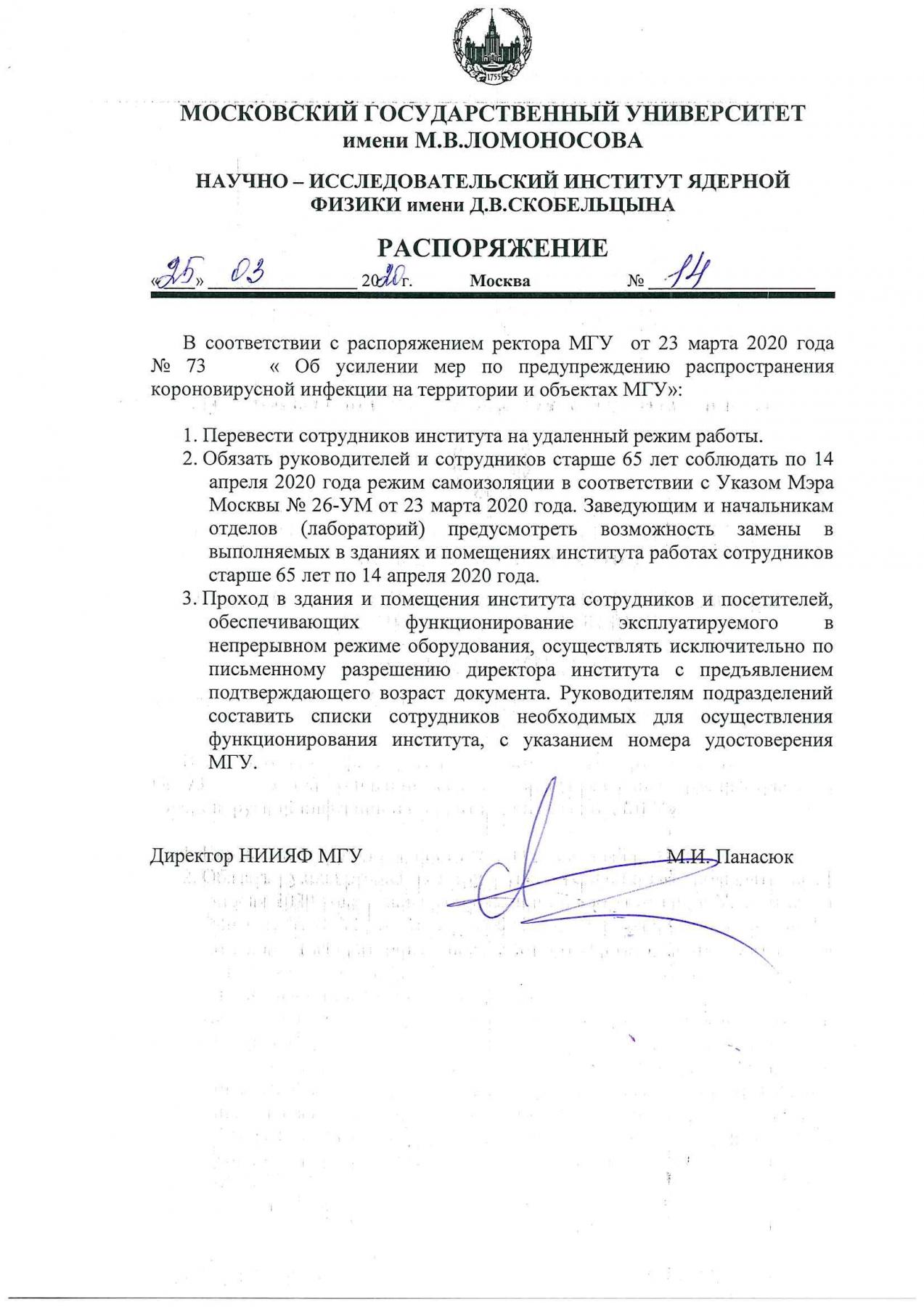 В соответствии с распоряжением директора НИИЯФ МГУ сотрудники института переходят на дистанционную работу. Руководителям подразделений института необходимо предусмотреть возможность замены сотрудников старше 65 лет, которые в соответствии с Указом Мэра Москвы обязаны соблюдать режим самоизоляции до 14 апреля 2020 года. Проход в здания и помещения института будет разрешен только для ограниченного числа сотрудников, обеспечивающих функционирование эксплуатируемого в непрерывном режиме оборудования, и будет осуществляться исключительно по письменному разрешению директора института с предъявлением подтверждающего возраст документа.