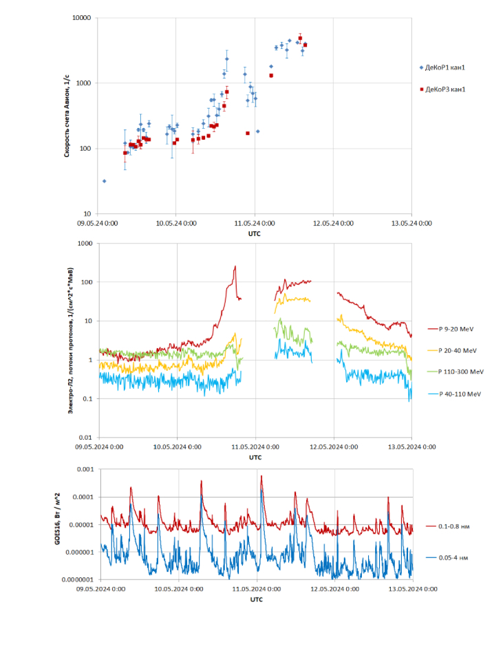 Пример одного из эффектов иллюстрирует рисунок, приведенный ниже, на котором представлены потоки солнечных космических лучей в полярных шапках по данным малого ИСЗ «Авион», имеющего круговую полярную орбиту (прибор ДеКор, верхняя панель), потоки солнечных протонов по данным ИСЗ «Электро-Л2», находящегося на геостационарной орбите (прибора DAS3, средняя панель) и поток мягкого рентгеновского излучения Солнца, регистрировавшегося на геостационарной орбите (нижняя панель, ИСЗ GOES).