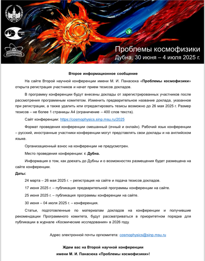 Открыта регистрация участников и начат прием тезисов докладов на участие в конференции имени М. И. Панасюка «Проблемы космофизики».